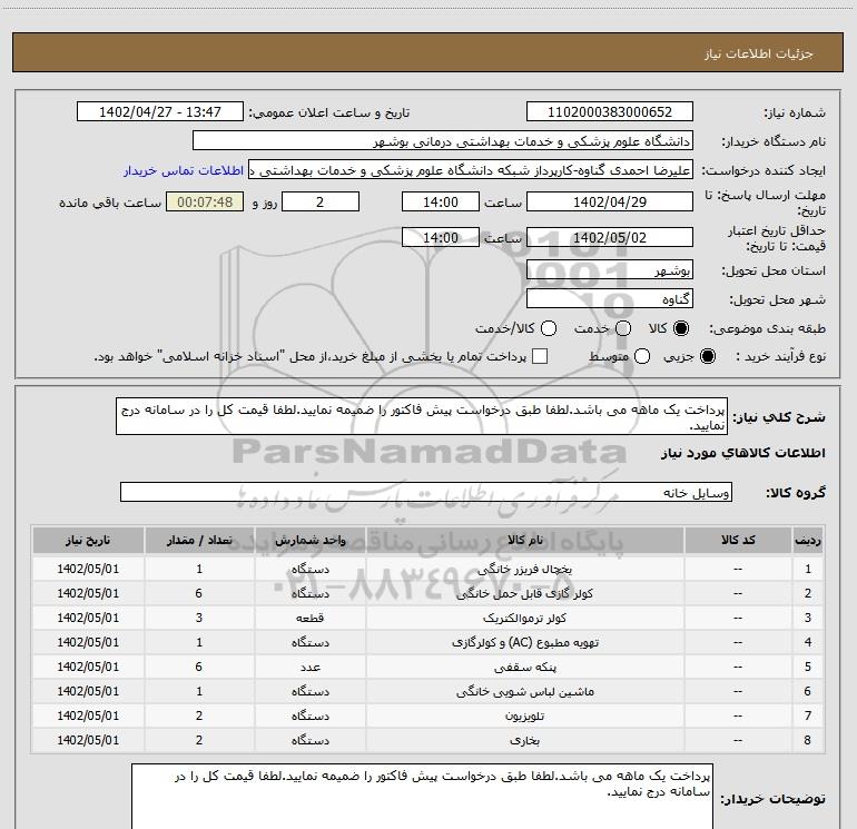 شرح کلی نیاز: پرداخت یک ماهه می باشد.لطفا طبق درخواست پیش فاکتور را ضمیمه نمایید.لطفا قیمت کل را در سامانه درج نمایید.