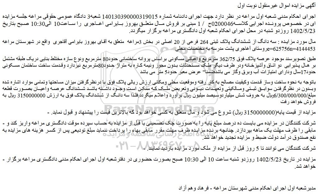 - مزایده در تاریخ 1402/5/23 روزدو شنبه ساعت 10 الی 10:30 صبح بصورت حضوری در دفترشعبه اول اجرای احکام مدنی دادگستری مراغه برگزار خواهد شد.
