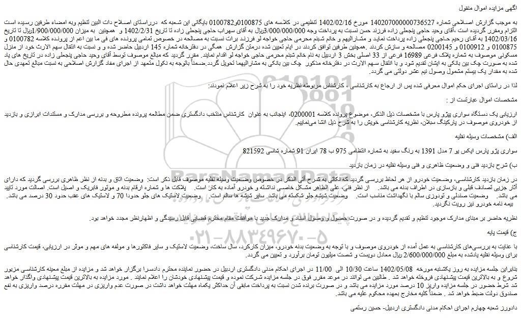 ارزیابی یک دستگاه سواری پپژو پارس با مشخصات ذیل الذکر، موضوع پرونده کلاسه 0200001، اینجانب به عنوان کارشناس منتخب دادگستری ضمن مطالعه پرونده مطروحه و بررسی مدارک و مستندات ابرازی و بازدید از خودروی موصوف در پارکینگ سبلان، نظریه کارشناسی خویش را به شرح ذیل انشا می نماییم.