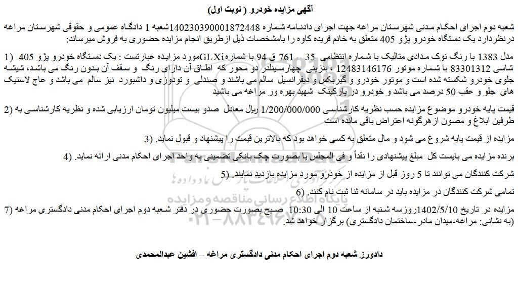 شعبه دوم اجرای احکام مدنی شهرستان مراغه جهت اجرای دادنامه شماره 140230390001872448شعبه 1 دادگاه عمومی و حقوقی شهرستان مراغه درنظردارد یک دستگاه خودرو پژو 405 متعلق به خانم فریده کاوه را بامشخصات ذیل ازطریق انجام مزایده حضوری به فروش میرساند:
