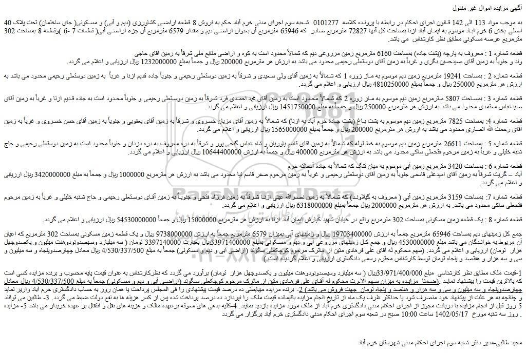 به موجب مواد 113 الی 142 قانون اجرای احکام در رابطه با پرونده کلاسه 0101277 شعبه سوم اجرای مدنی خرم آباد حکم به فروش 8 قطعه اراضی کشاورزی (دیم و آبی) و مسکونی( جای ساختمان) تحت پلاک 40 اصلی بخش 6 خرم اباد موسوم به ایمان آباد ازنا بمساحت کل آنها 72827 مترمربع صادر که 65946 مترمربع آن بعنوان اراضی دیم و مقدار 6579 مترمربع آن جزء اراضی آبی( قطعات 7 -6 )وقطعه 8 بمساحت 302 مترمربع عرصه مسکونی مطابق نظر کارشناس می باشد.