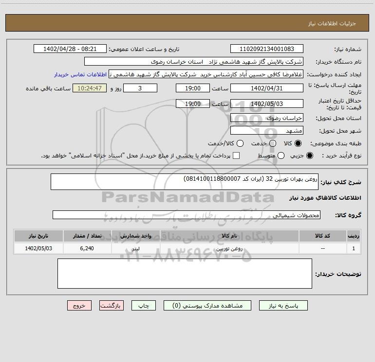 شرح کلی نیاز: روغن بهران توربین 32 (ایران کد 0814100118800007)