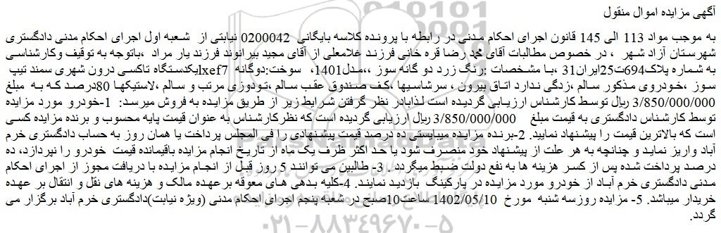 به موجب مواد 113 الی 145 قانون اجرای احکام مدنی در رابطه با پرونده کلاسه بایگانی 0200042 نیابتی از شعبه اول اجرای احکام مدنی دادگستری شهرستان آزاد شهر ، در خصوص مطالبات آقای محمد رضا قره خانی فرزند غلامعلی از آقای مجید بیرانوند فرزند یار مراد ،باتوجه به توقیف وکارشناسی یکدستگاه تاکسی درون شهری سمند تیپ lxef7 به شماره پلاک694ت25ایران31 ،با مشخصات :رنگ زرد دو گانه سوز ،،مدل1401، سوخت:دوگانه سوز ،خودروی مذکور سالم ،زدگی ندارد اتاق بیرون ، سرشاسیها ،کف صندوق عقب سالم ،تودوزی مرتب و سالم ،لاستیکها 80درصد که به مبلغ 3/850/000/000 ریال توسط کارشناس ارزیابی گردیده است لذابادر نظر گرفتن شرایط زیر از طریق مزایده به فروش میرسد: 1-خودرو مورد مزایده توسط کارشناس دادگستری به قیمت مبلغ 3/850/000/000 ریال ارزیابی گردیده است که نظرکارشناس به عنوان قیمت پایه محسوب و برنده مزایده کسی است که بالاترین قیمت را پیشنهاد نمایید. 2-برنده مزایده میبایستی ده درصد قیمت پیشنهادی را فی المجلس پرداخت یا همان روز به حساب دادگستری خرم آباد واریز نماید و چنانچه به هر علت از پیشنهاد خود منصرف شود یا حد اکثر ظرف یک ماه از تاریخ انجام مزایده باقیمانده قیمت خودرو را نپردازد، ده درصد پرداخت شده پس از کسر هزینه ها به نفع دولت ضبط میگردد . 3- طالبین می توانند 5 روز قبل از انجام مزایده با دریافت مجوز از اجرای احکام مدنی دادگستری خرم آباد از خودرو مورد مزایده در پارکینگ بازدید نمایند. 4-کلیه بدهی های معوقه برعهده مالک و هزینه های نقل و انتقال بر عهده خریدار میباشد. 5- مزایده روزسه شنبه مورخ 1402/05/10 ساعت10صبح در شعبه پنجم اجرای احکام مدنی (ویژه نیابت)دادگستری خرم آباد برگزار می گردد.