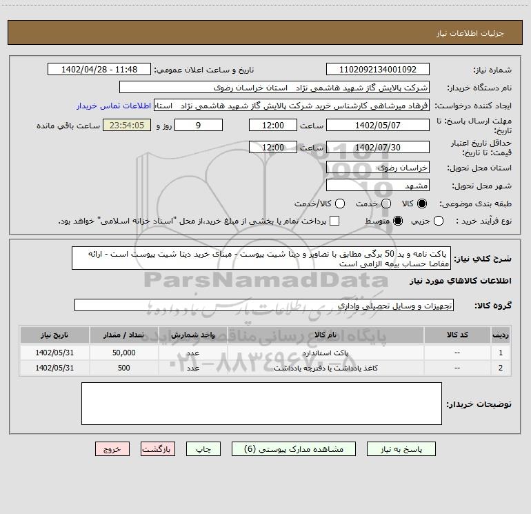 شرح کلی نیاز: پاکت نامه و پد 50 برگی مطابق با تصاویر و دیتا شیت پیوست - مبنای خرید دیتا شیت پیوست است - ارائه مفاصا حساب بیمه الزامی است