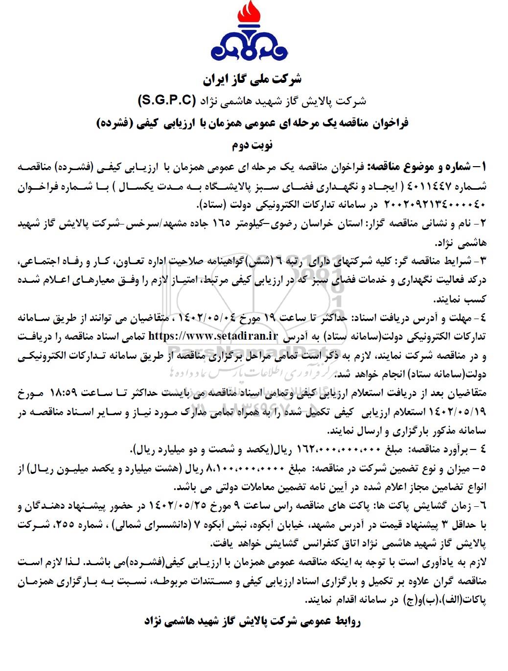 1- شماره و موضوع مناقصه: فراخوان مناقصه یک مرحله ای عمومی همزمان با ارزیابی کیفی (فشرده) شماره 4011447 (ایجاد و نگهداری فضای سبز پالایشگاه به مدت یکسال) با شماره فراخوان 2002092134000040 در سامانه تدارکات الکترونیکی دولت ستاد
