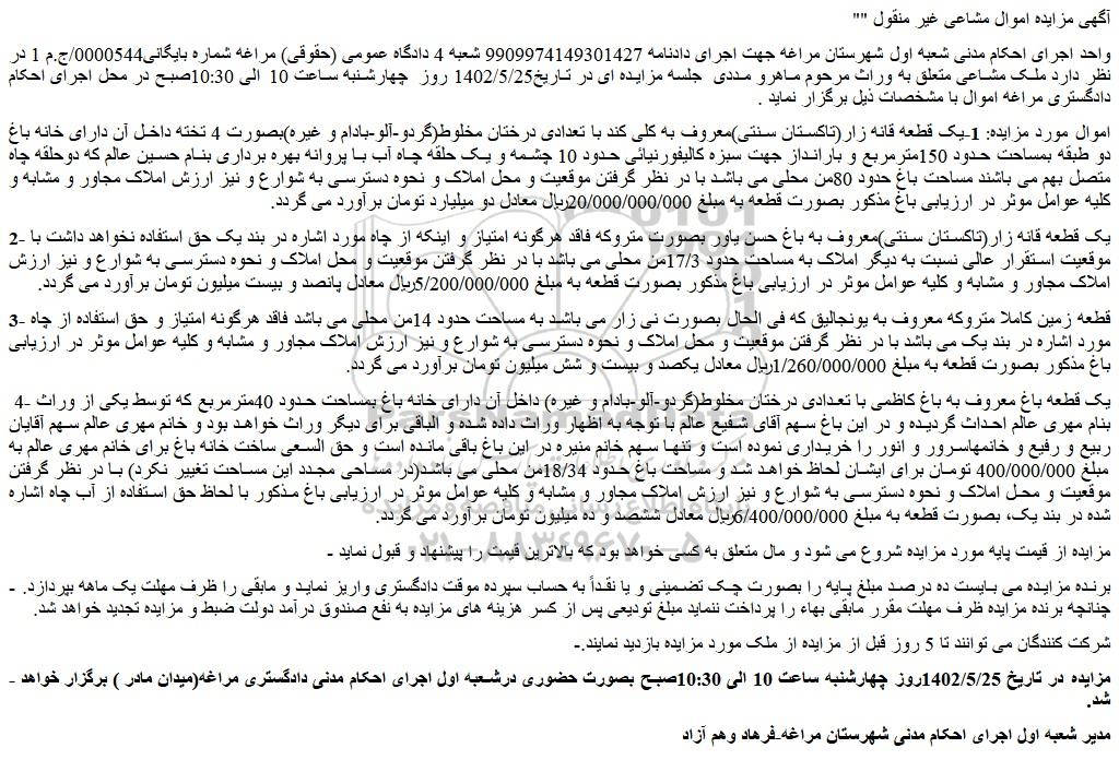 - مزایده در تاریخ 1402/5/25روز چهارشنبه ساعت 10 الی 10:30صبح بصورت حضوری درشعبه اول اجرای احکام مدنی دادگستری مراغه(میدان مادر ) برگزار خواهد شد.