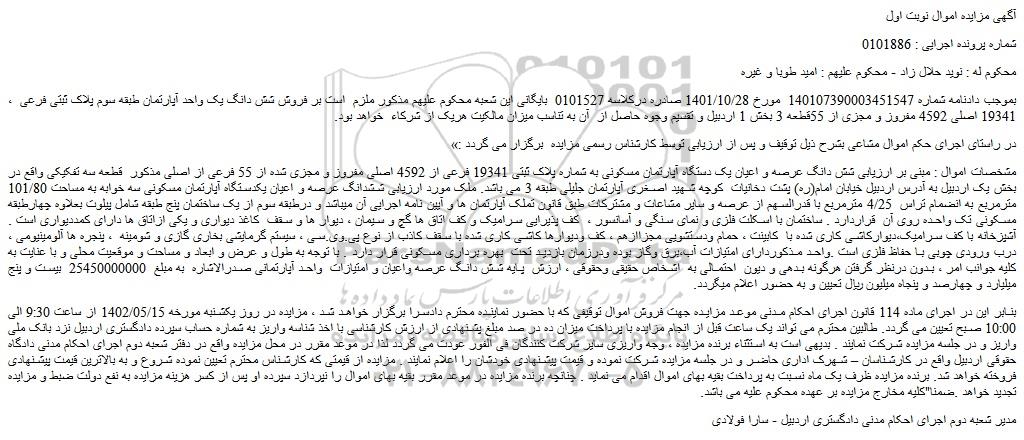، بموجب دادنامه شماره 140107390003451547 مورخ 1401/10/28 صادره درکلاسه 0101527 بایگانی این شعبه محکوم علیهم مذکور ملزم است بر فروش شش دانگ یک واحد آپارتمان طبقه سوم پلاک ثبتی فرعی 19341 اصلی 4592 مفروز و مجزی از 55قطعه 3 بخش 1 اردبیل و تقسیم وجوه حاصل از آن به تناسب میزان مالکیت هریک از شرکاء خواهد بود.