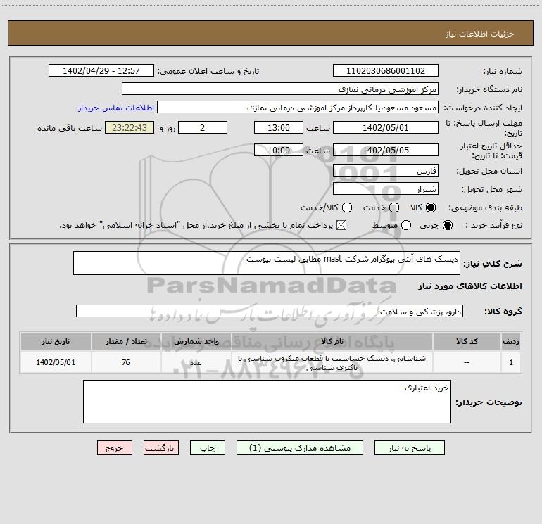 شرح کلی نیاز: دیسک های آنتی بیوگرام شرکت mast مطابق لیست پیوست