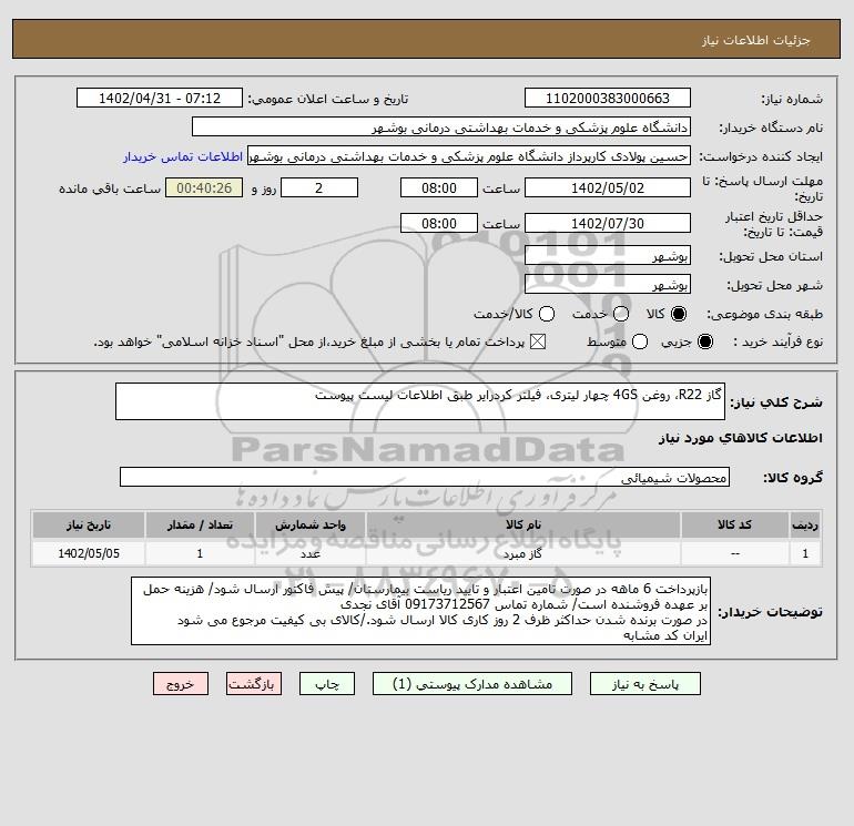 شرح کلی نیاز: گاز R22، روغن 4GS چهار لیتری، فیلتر کردرایر طبق اطلاعات لیست پیوست