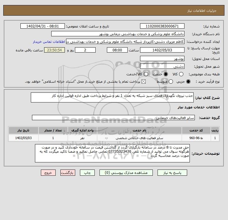 شرح کلی نیاز: جذب نیروی نگهداری فضای سبز شبکه به تعداد 1 نفر و شرایط پرداخت طبق اداره قوانین اداره کار