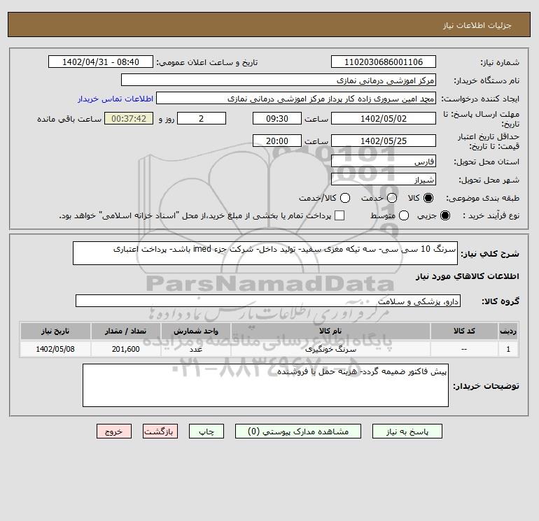 شرح کلی نیاز: سرنگ 10 سی سی- سه تیکه مغزی سفید- تولید داخل- شرکت جزء imed باشد- پرداخت اعتباری