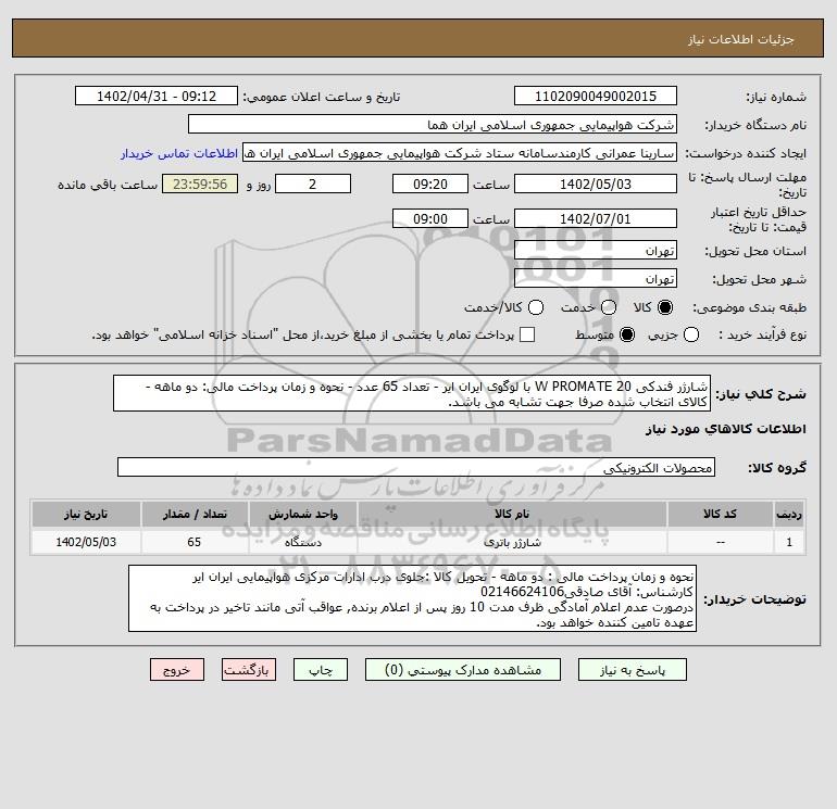 شرح کلی نیاز: شارژر فندکی 20 W PROMATE با لوگوی ایران ایر - تعداد 65 عدد - نحوه و زمان پرداخت مالی: دو ماهه - کالای انتخاب شده صرفا جهت تشابه می باشد.
