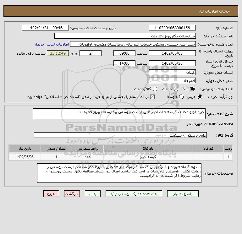 شرح کلی نیاز: خرید انواع مختلف کیسه های ادرار طبق لیست پیوستی بیمارستان پیروز لاهیجان