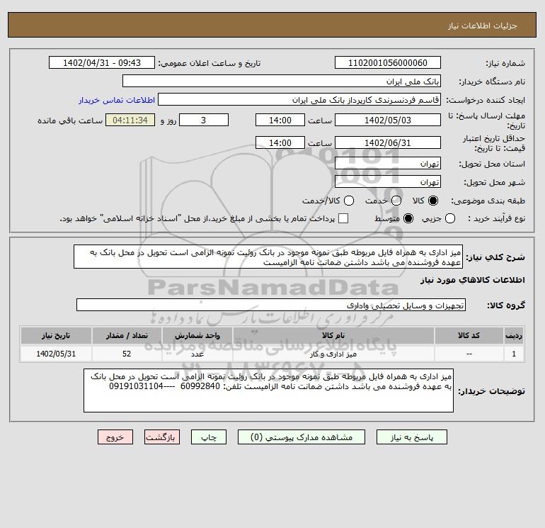 شرح کلی نیاز: میز اداری به همراه فایل مربوطه طبق نمونه موجود در بانک روئیت نمونه الزامی است تحویل در محل بانک به عهده فروشنده می باشد داشتن ضمانت نامه الزامیست