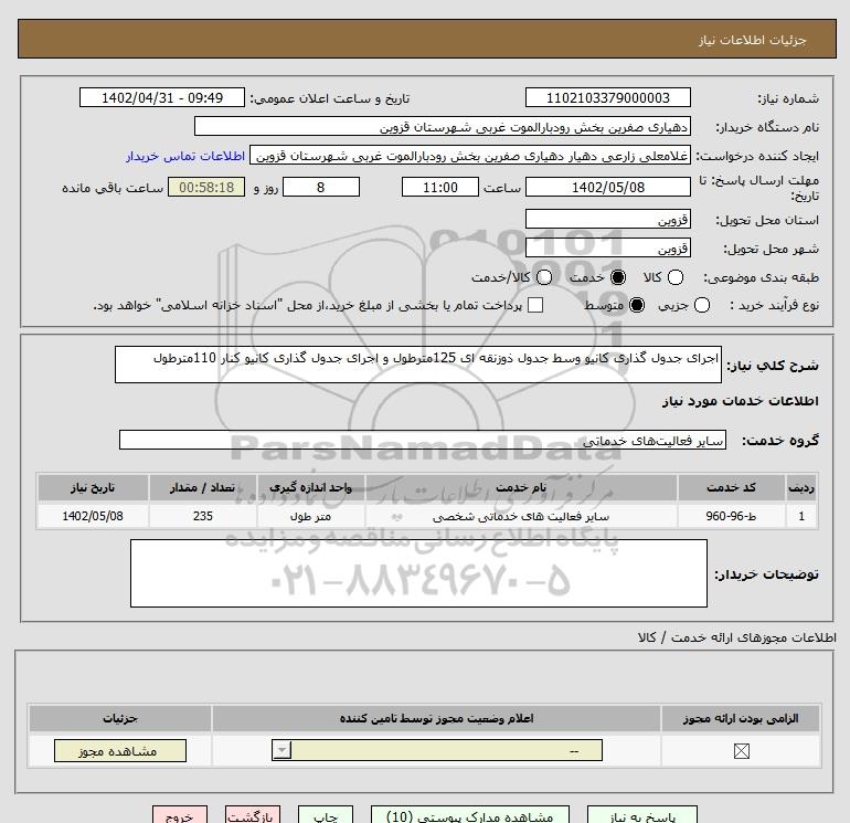 شرح کلی نیاز: اجرای جدول گذاری کانیو وسط جدول ذوزنقه ای 125مترطول و اجرای جدول گذاری کانیو کنار 110مترطول