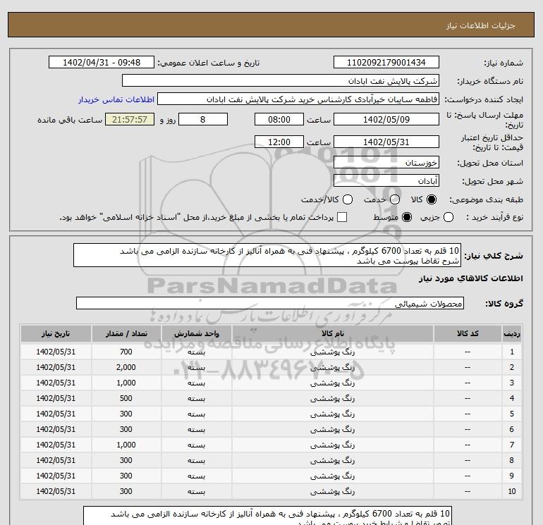 | 7 | -- | رنگ پوششی | بسته | 1,000 | 1402/05/31 |