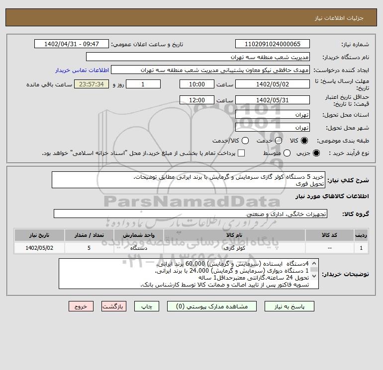 شرح کلی نیاز: خرید 5 دستگاه کولر گازی سرمایش و گرمایش با برند ایرانی مطابق توضیحات.
