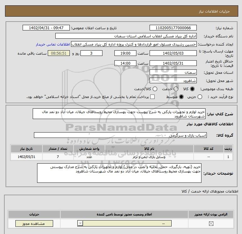 شرح کلی نیاز: خرید لوازم و تجهیزات پارکی به شرح پیوست جهت بهسازی محیط روستاهای جیلان، میان آباد دو نمد مال شهرستان شاهرود
