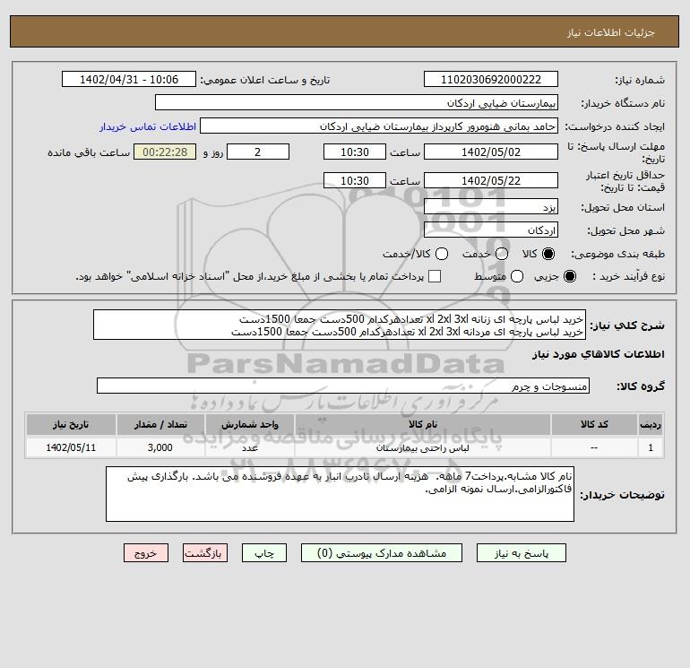 شرح کلی نیاز: خرید لباس پارچه ای زنانه xl 2xl 3xl تعدادهرکدام 500دست جمعا 1500دست