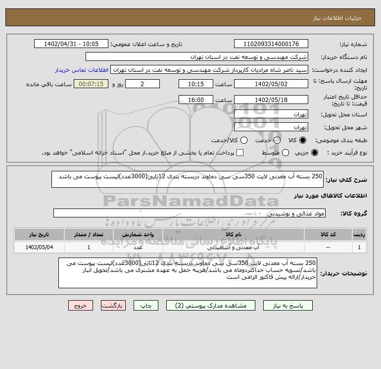 شرح کلی نیاز: 250 بسته آب معدنی لایت 350سی سی دماوند دربسته بندی 12تایی(3000عدد)لیست پیوست می باشد