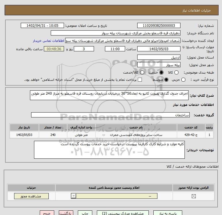 شرح کلی نیاز: اجرای جدول گذاری بصورت کانیو به ابعاد50*30 درخیابان آذربایجان روستای قره قاسملو به متراژ 240 متر طولی