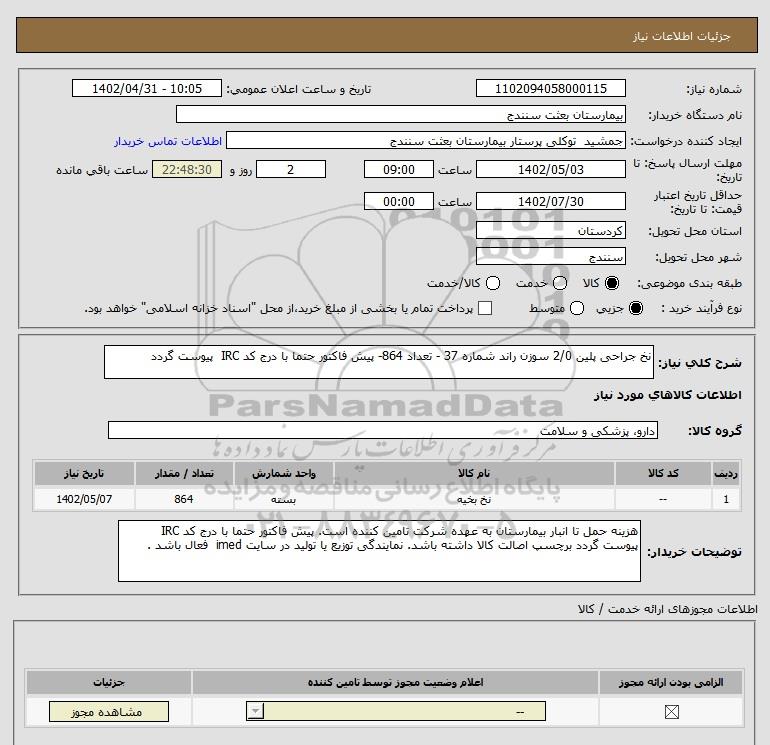 شرح کلی نیاز: نخ جراحی پلین 2/0 سوزن راند شماره 37 - تعداد 864- پیش فاکتور حتما با درج کد IRC پیوست گردد