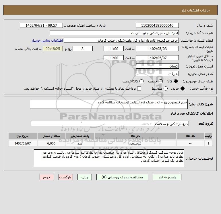 توضیحات خریدار:قابل توجه شرکت کنندگاه محترم : سم مورد نیاز فلومترن پور ان بطری نیم لیتری می باشد و روی هر بطری باید عبارت ( رایگان به سفارش اداره کل دامپزشکی جنوب کرمان ) درج گردد .از قیمت گذاری بطری یک لیتری اجتناب گردد .