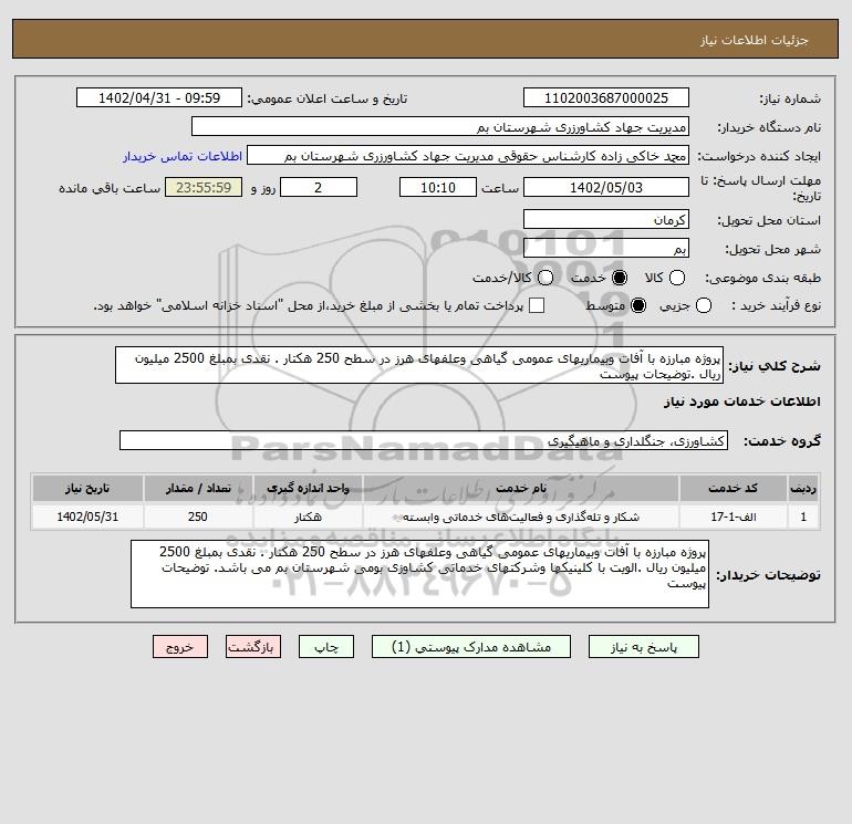 شرح کلی نیاز: پروژه مبارزه با آفات وبیماریهای عمومی گیاهی وعلفهای هرز در سطح 250 هکتار . نقدی بمبلغ 2500 میلیون ریال .توضیحات پیوست