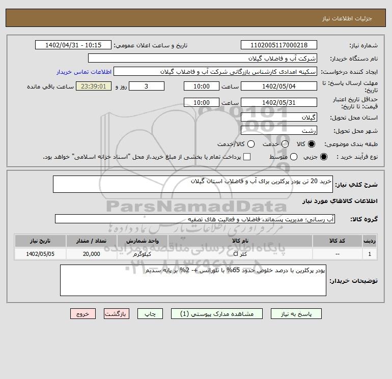 شرح کلی نیاز: خرید 20 تن پودر پرکلرین برای آب و فاضلاب استان گیلان