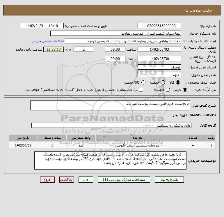 | 1 | -- | ملزومات سیستم آزمایش آلبومین | عدد | 1 | 1402/05/05 |