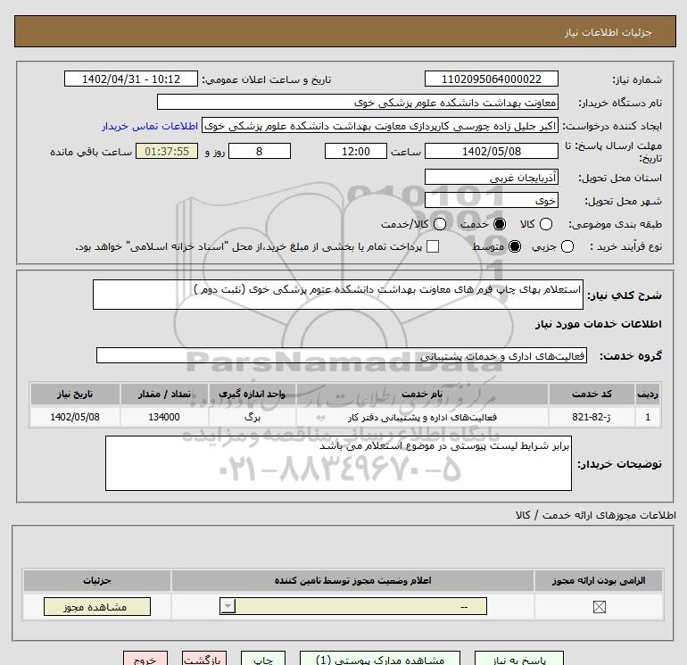 شرح کلی نیاز: استعلام بهای چاپ فرم های معاونت بهداشت دانشکده عتوم پزشکی خوی (نئبت دوم )