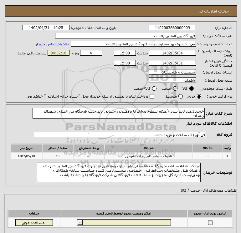شرح کلی نیاز: خرید15عدد تابلو ساین(علائم سطوح پروازی)با بردکنترل روشنایی باند جهت فرودگاه بین المللی شهدای زاهدان