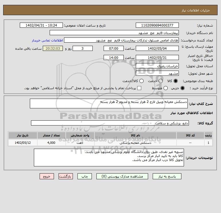 شرح کلی نیاز: دستکش معیانه وینیل لارج 2 هزار بسته و مدیوم 2 هزار بسته