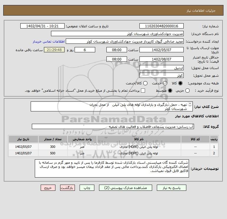 استعلام تهیه ، حمل ،بارگیری و باراندازی لوله های پلی اتیلن از محل بحران شهرستان کوثر, استعلام تهیه ، حمل ،بارگیری و باراندازی لوله های پلی اتیلن از محل بحران شهرستان کوثر