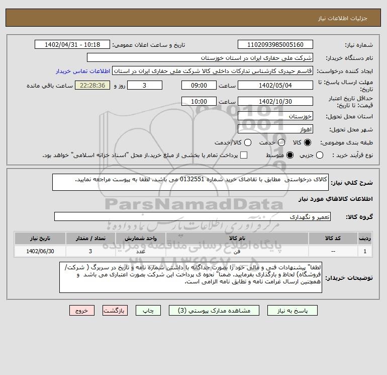 شرح کلی نیاز: کالای درخواستی مطابق با تقاضای خرید شماره 0132551 می باشد. لطفا به پیوست مراجعه نمایید.