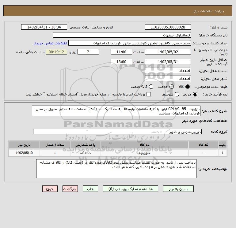 شرح کلی نیاز: تلوزیون GPLAS 85 اینچ با کلیه متعلقات وابسته به تعداد یک دستگاه با ضمانت نامه معتبر تحویل در محل فرمانداری اصفهان میباشد