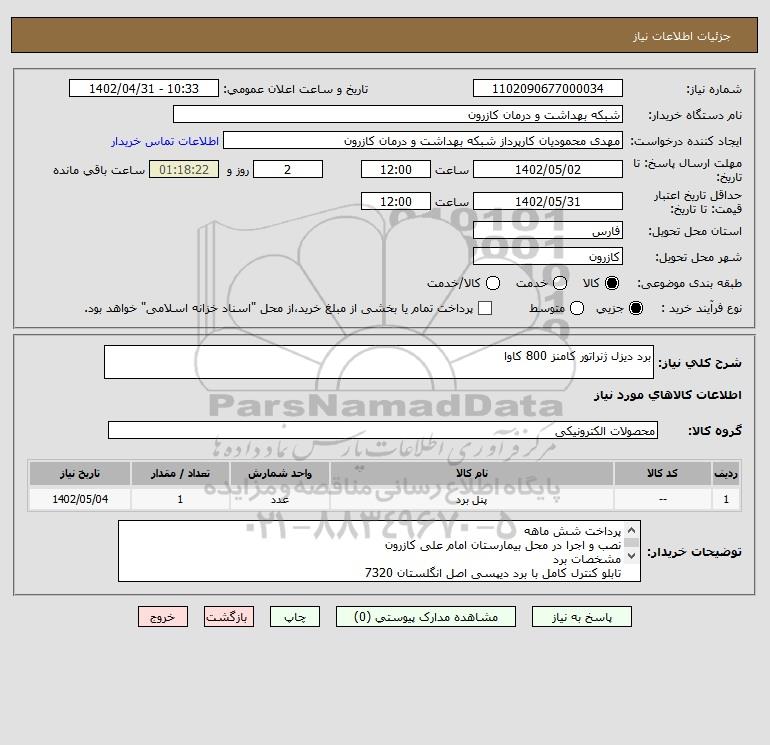 شرح کلی نیاز: برد دیزل ژنراتور کامنز 800 کاوا