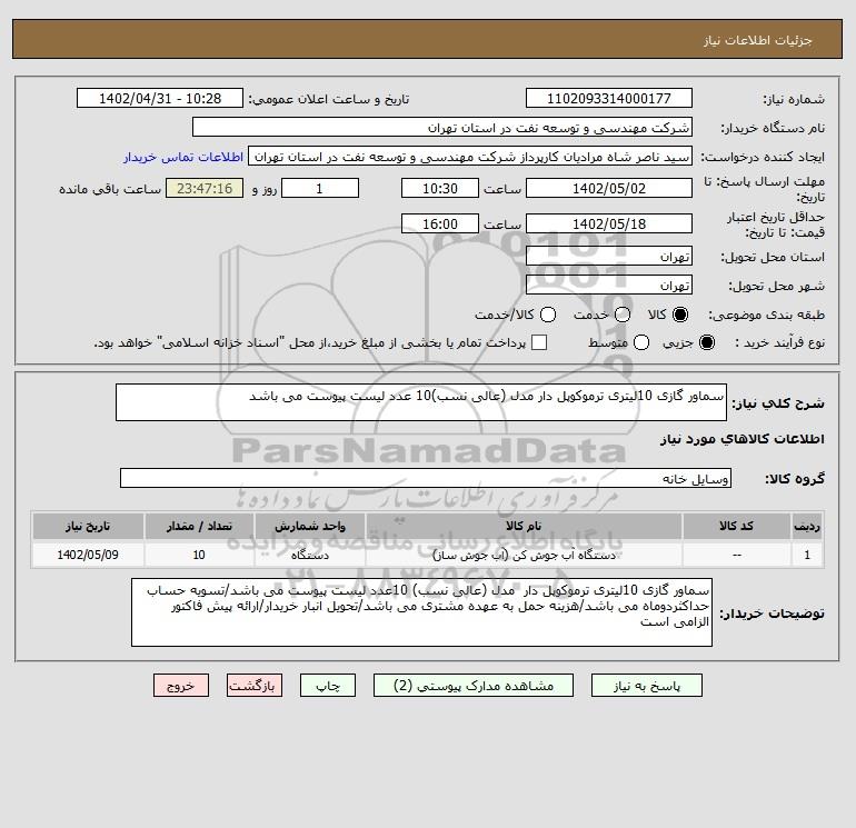 شرح کلی نیاز: سماور گازی 10لیتری ترموکوپل دار مدل (عالی نسب)10 عدد لیست پیوست می باشد