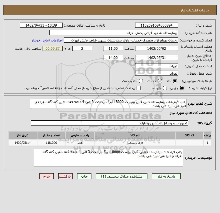 شرح کلی نیاز: چاپ فرم های بیمارستان طبق فایل پیوست 118000برگ پرداحت 3 الی 4 ماهه فقط تامین کنندگان تهران و البرز موردتایید می باشد