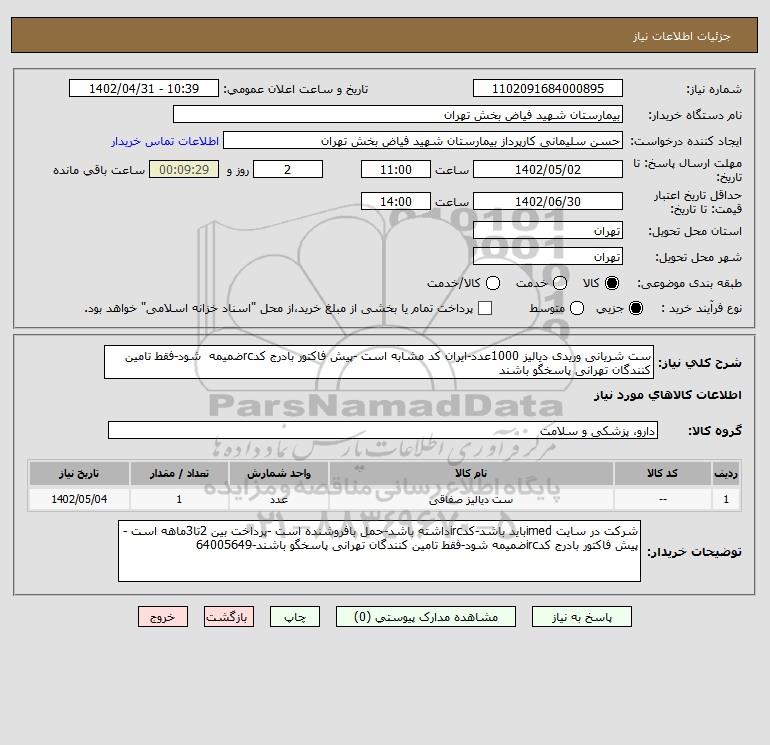 شرح کلی نیاز: ست شریانی وریدی دیالیز 1000عدد-ایران کد مشابه است -پیش فاکتور بادرج کدrcضمیمه شود-فقط تامین کنندگان تهرانی پاسخگو باشند