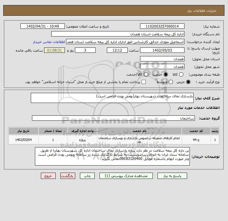 شرح کلی نیاز: بازسازی نمای ساختمان شهرستان بهار(بومی بودن الزامی است)