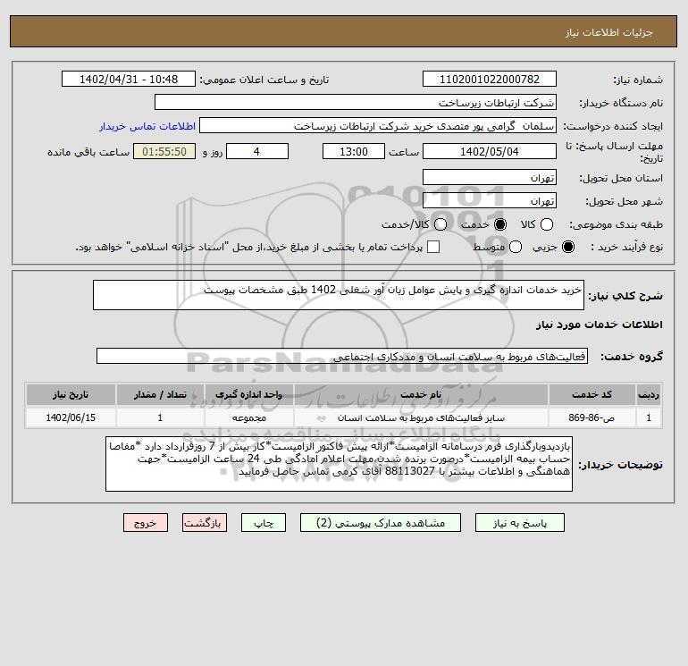 شرح کلی نیاز: خرید خدمات اندازه گیری و پایش عوامل زیان آور شغلی 1402 طبق مشخصات پیوست
