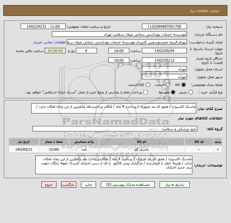 شرح کلی نیاز: ماسک اکسیژن / مجوز ای مد ضروری / پرداخت 4 ماه / امکان پرداخت نقد وکمترین از این زمان امکان ندارد /