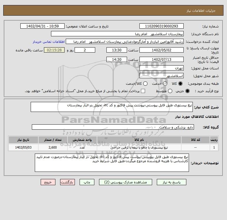 شرح کلی نیاز: تیغ بیستوری طبق فایل پیوستی-پیوست پیش فاکتور و کد irc- تحویل در انبار بیمارستان