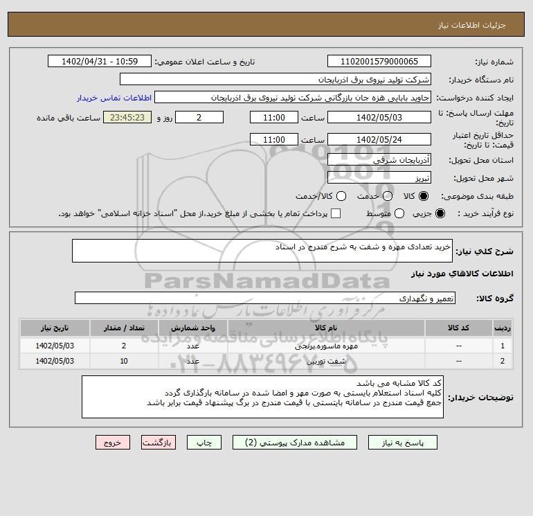| 2 | -- | شفت توربین | عدد | 10 | 1402/05/03 |