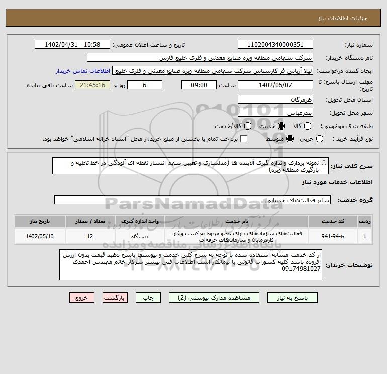 شرح کلی نیاز: نمونه برداری واندازه گیری آلاینده ها (مدلسازی و تعیین سهم انتشار نقطه ای آلودگی در خط تخلیه و بارگیری منطقه ویژه)