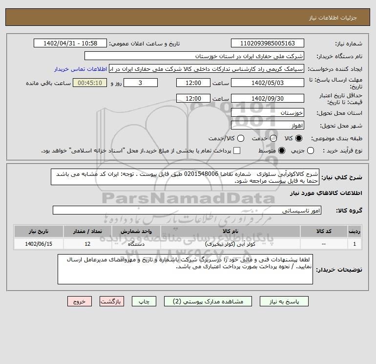 شرح کلی نیاز: شرح کالاکولرآبی سلولزی شماره تقاضا 0201548006 طبق فایل پیوست . توجه: ایران کد مشابه می باشد حتما به فایل پیوست مراجعه شود.