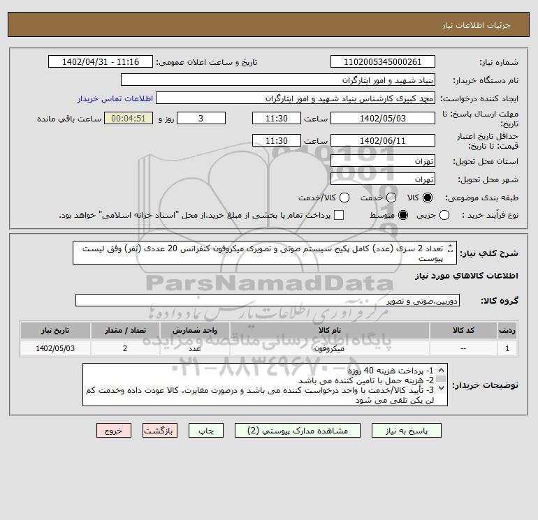 شرح کلی نیاز: تعداد 2 سری (عدد) کامل پکیج سیستم صوتی و تصویری میکروفون کنفرانس 20 عددی (نفر) وفق لیست پیوست