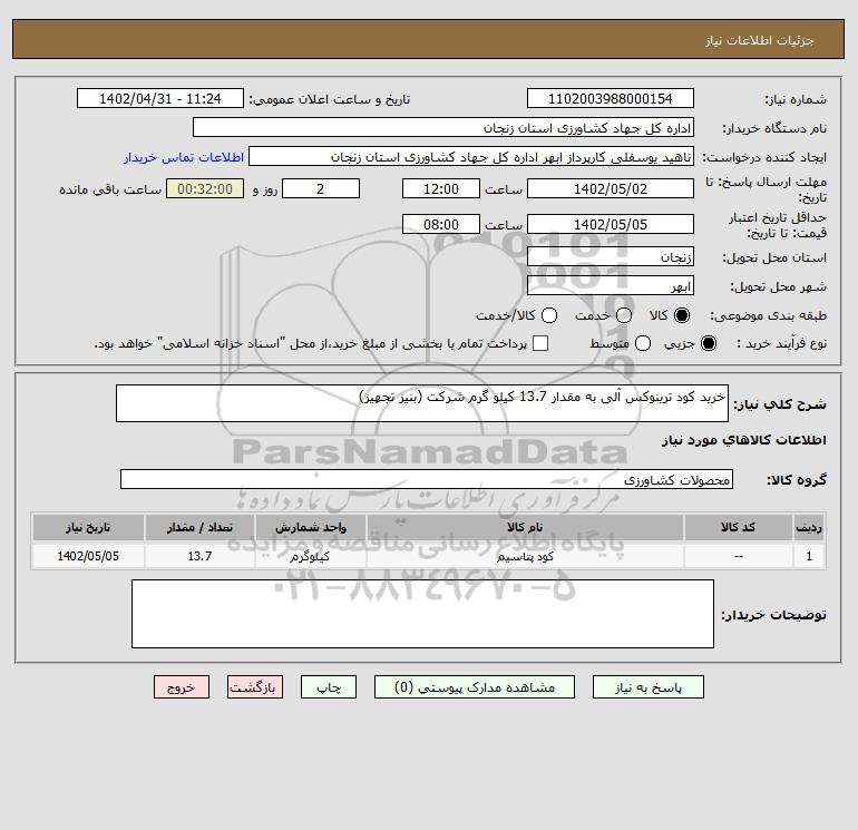 شرح کلی نیاز: خرید کود ترینوکس آلی به مقدار 13.7 کیلو گرم شرکت (بنیز تجهیز)
