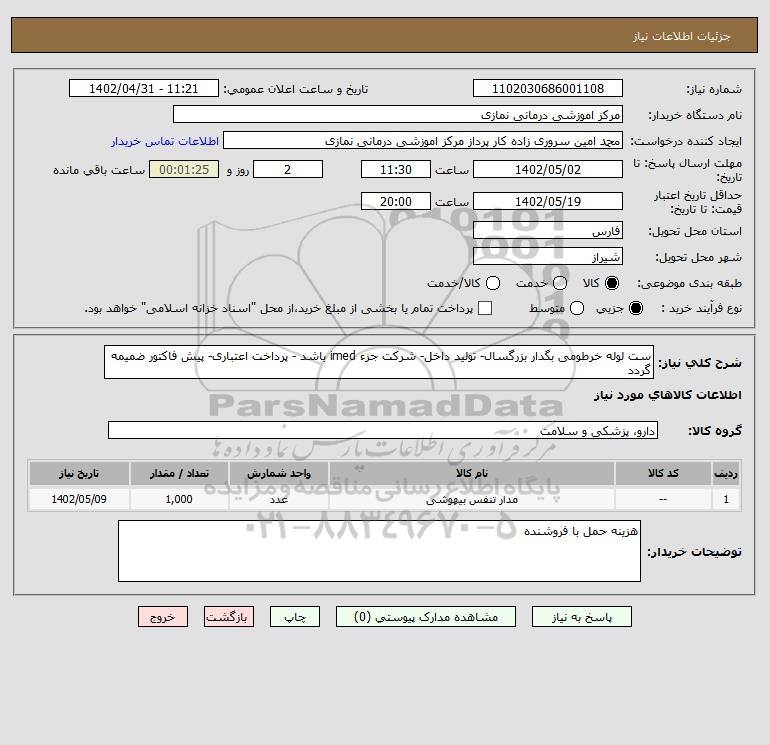شرح کلی نیاز: ست لوله خرطومی بگدار بزرگسال- تولید داخل- شرکت جزء imed باشد - پرداخت اعتباری- پیش فاکتور ضمیمه گردد